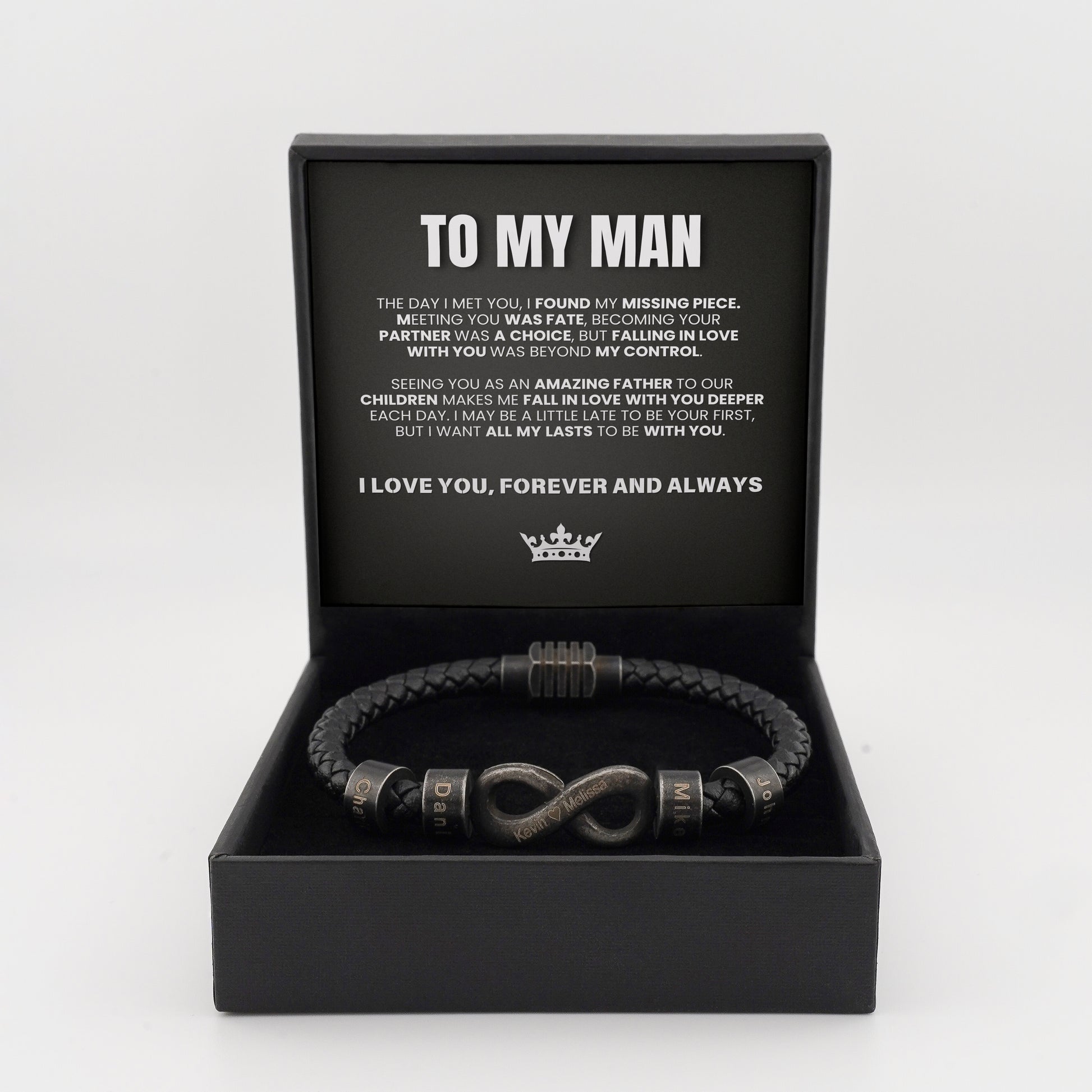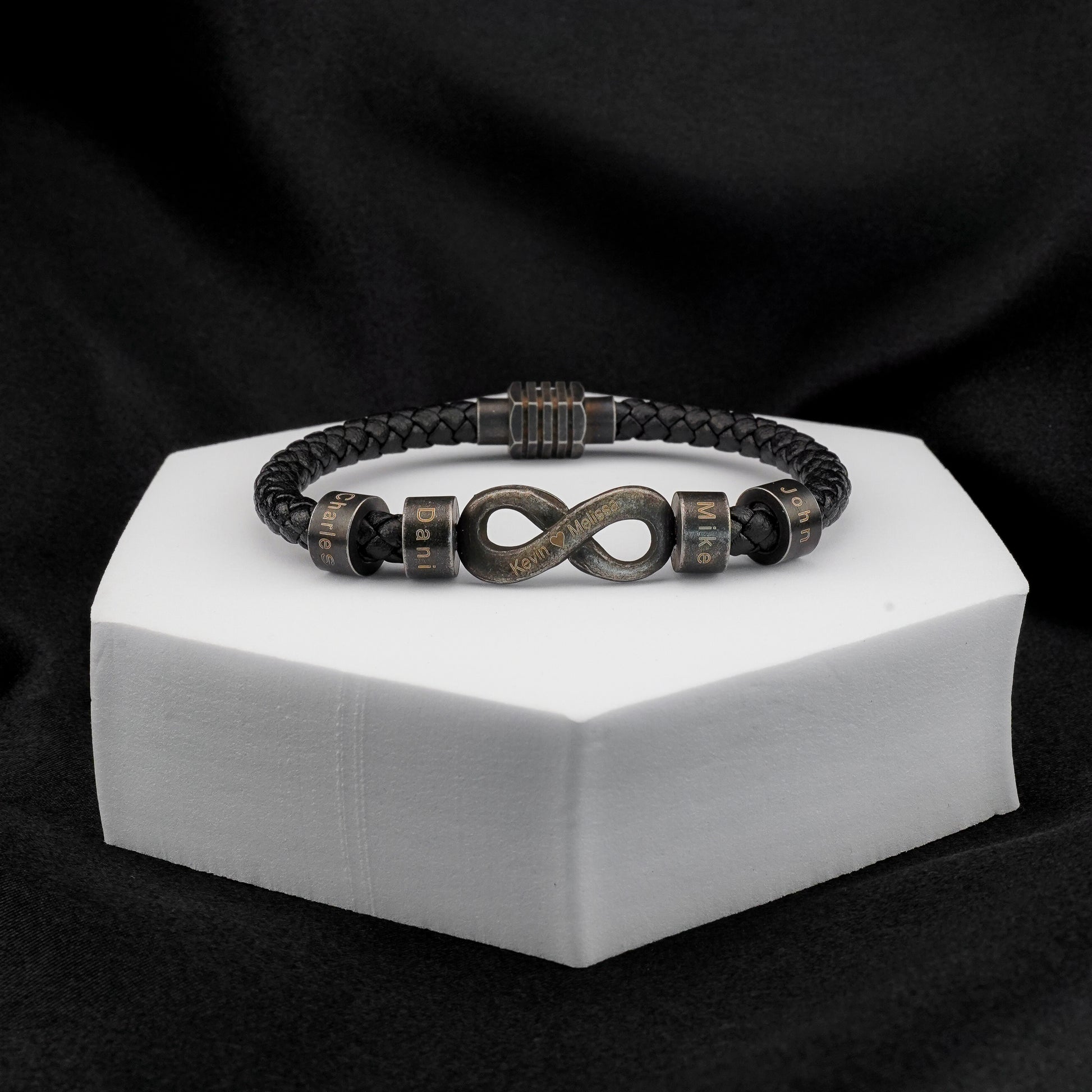 Wir gravieren bis zu 6 Familiennamen auf die Perlen, zusammen mit einem speziellen Unendlichkeitssymbol mit Ihren Namen. Es ist wie eine Erinnerung an seine Lieben, die er überallhin mitnehmen kann.