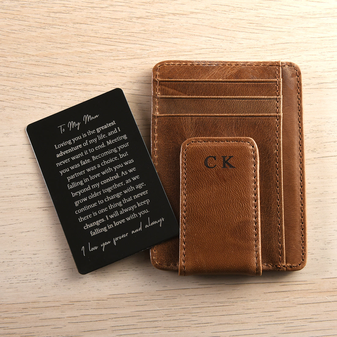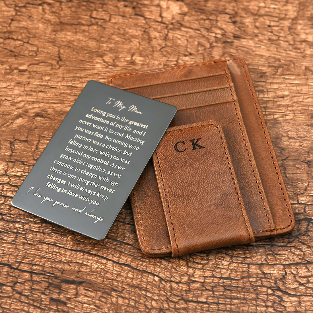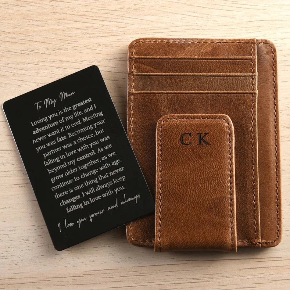 Este exclusivo set combina la practicidad de una cartera grabada a medida con el sincero mensaje del tarjetero metálico, para que se sienta querido y apreciado cada día.