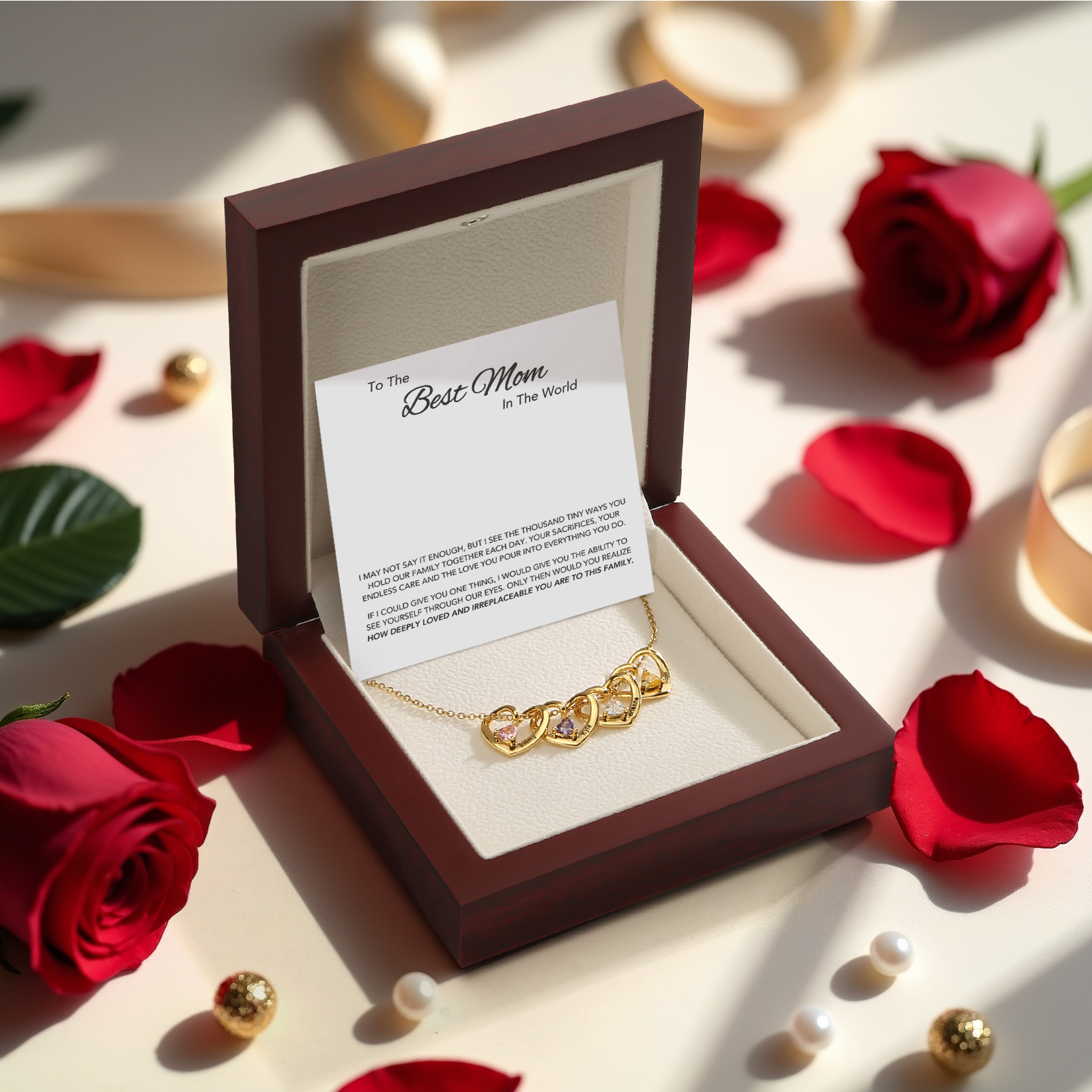 Each small heart on the necklace represents a child she loves. Together, they create a quiet symbol of the family she holds so close. It’s a piece she’ll wear with pride, knowing it carries the ones who matter most.
